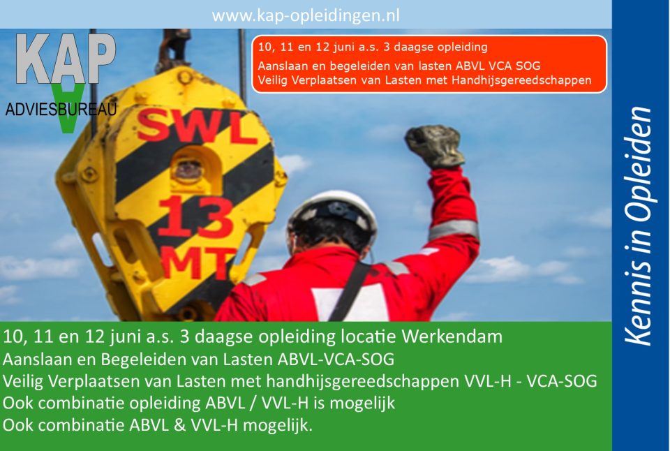 Op 10, 11 en 12 juni a.s. organiseren wij de opleiding Aanslaan en begeleiden van lasten ABVL – VCA SOG en de opleiding Veilig Verplaatsen van lasten met handhijsgereedschappen VVL-H VCA SOG.