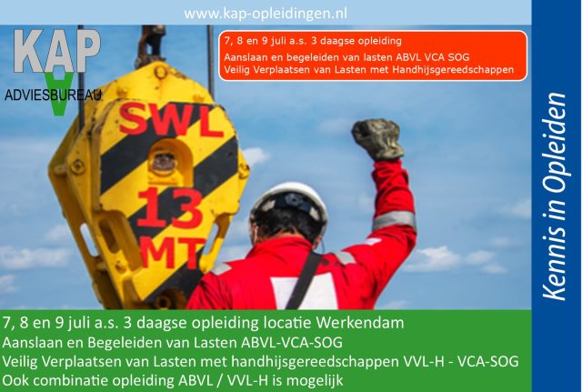 Op 7, 8 en 9 juli a.s. organiseren wij de opleiding Aanslaan en begeleiden van lasten ABVL – VCA SOG en de opleiding Veilig Verplaatsen van lasten met handhijsgereedschappen VVL-H VCA SOG. Ook een combinatie van de beide opleidingen is mogelijk.